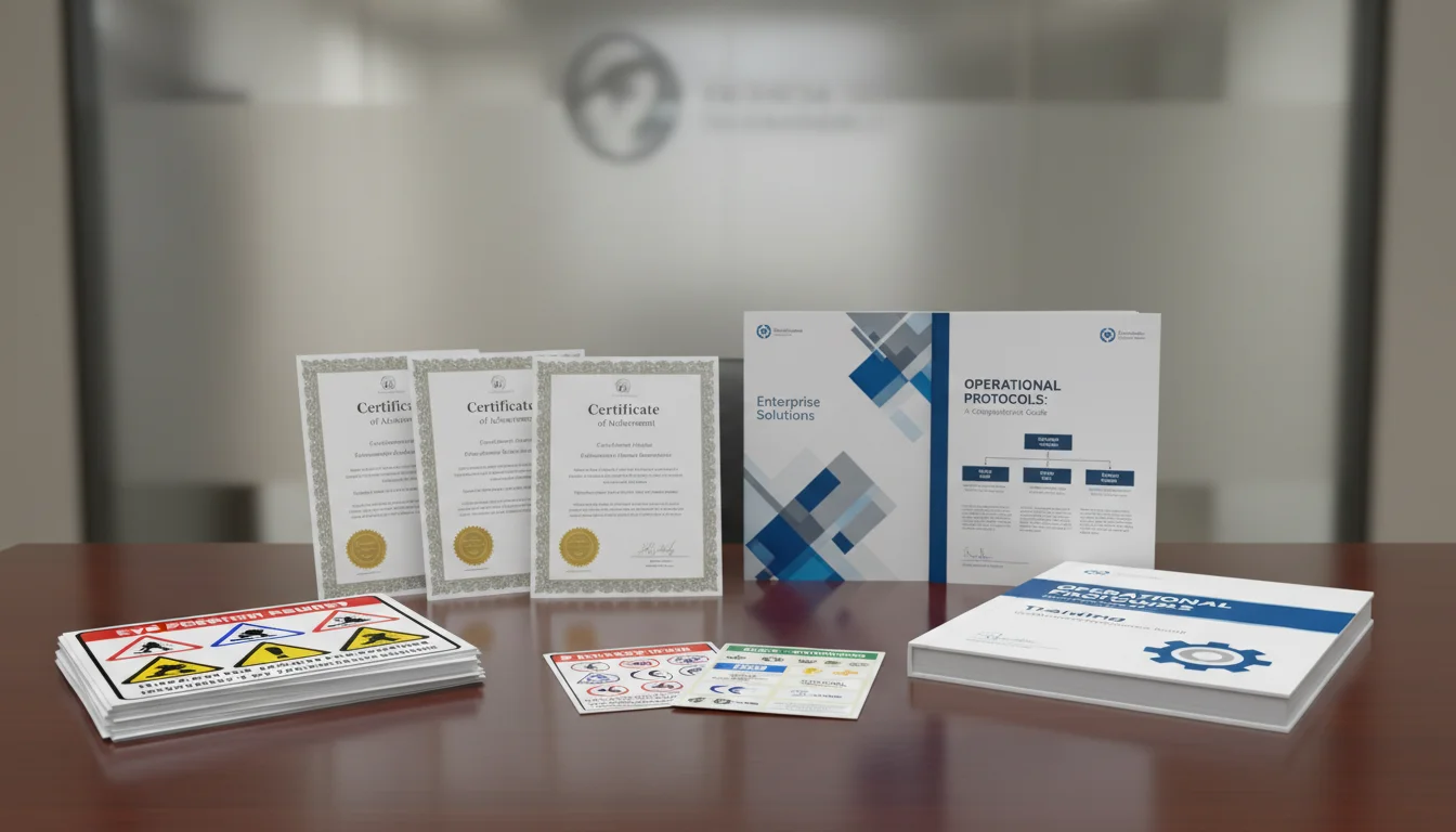 We specialize in security-printed official documents and forms, regulatory compliance labels for assets, OSHA-compliant safety and wayfinding signage, and institutional materials like annual reports and training manuals. All production includes full audit documentation.